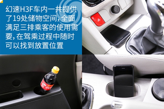 1.多达19处的储物空间。丰富而实用的储物空间是一款优秀的家用MPV所应该具备的。幻速H3F车内一共提供了19处储物空间,全面满足三排乘客的使用需要,让你在驾乘过程中随时可以找到方便的放置位置。