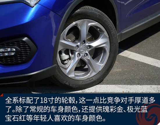 全系标配了18寸的轮毂,这一点比竞争对手厚道多了。除了常规的车身颜色,还提供瑰彩金、极光蓝、宝石红等年轻人喜欢的车身颜色。