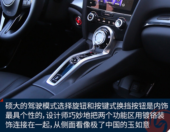 硕大的驾驶模式选择旋钮和按键式换挡按钮则是内饰部分最具个性的部分,设计师巧妙地把两个功能区用镀铬装饰连接在一起,从侧面看像极了中国的玉如意,不过我更相信这是一种巧合。