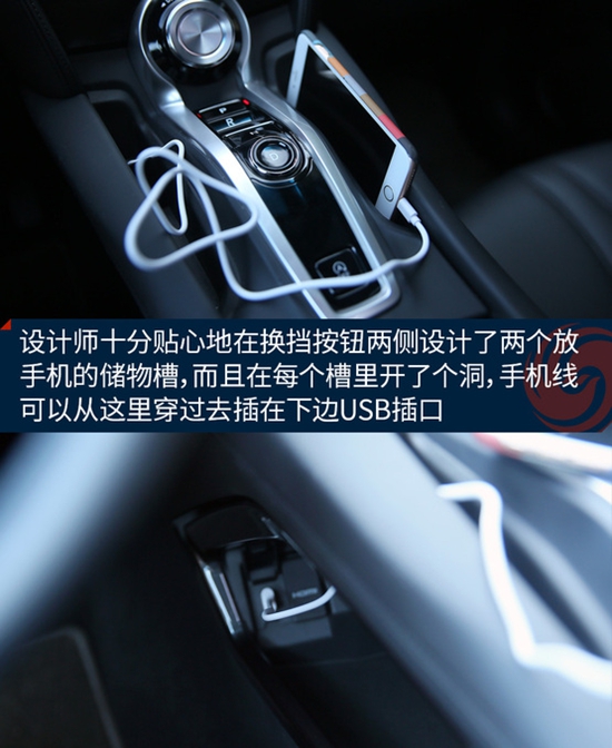 “玉如意”的下方设计了一个较大的储物空间,十分实用,但这不是我要说的重点。设计师十分贴心地在换挡按钮两侧设计了两个放手机的储物槽,而且在每个槽里开了个洞,手机线可以从这里穿过去插在下边USB插口。设计不仅贴心,而且也充分诠释了个性的部分。