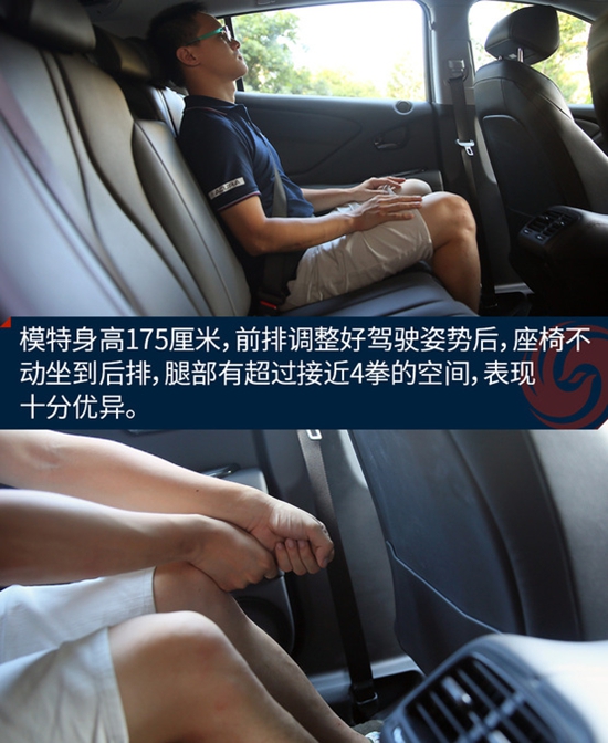 虽然讴歌CDX的轴距只有2660毫米,算不上突出,但是实际的乘坐效果足够宽敞。如下图所示,模特身高175厘米,前排调整好驾驶姿势后,座椅不动坐到后排,腿部有超过接近4拳的空间,表现十分优异。这样的空间表现,及时前后排坐的都是身高185厘米的大个子,也可以舒适地坐下。