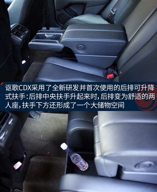讴歌CDX采用了全新研发并首次使用的后排可升降式扶手:后排中央扶手升起来时,后排变为舒适的两人座,扶手下方还形成了一个大储物空间。既新颖又时尚,相信这又是一个讨年轻人喜欢的设计。