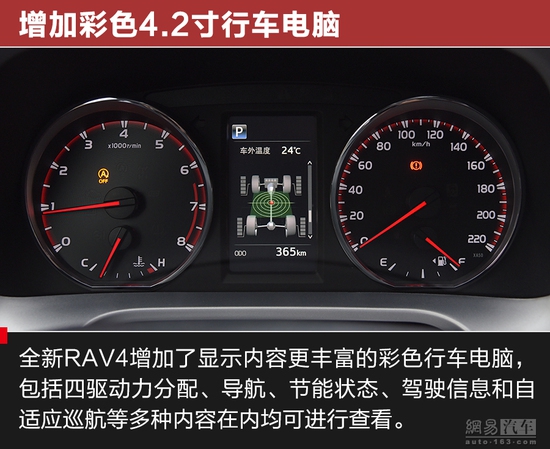 内饰方面并没有进行大刀阔斧的改动,调整都是在细节之处。首先,行车电脑换成了4.2寸的彩色屏幕,用来显示更加丰富的信息。