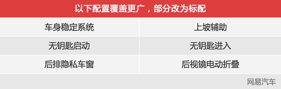 配置上的调整也是这次改款车型的重点之一,基本体现在两点:一是标准配置更加丰富,二是科技配置进一步提升。比如之前在中高配车型才有的车身稳定系统和上坡辅助功能,在新款车型上则成为了标配。