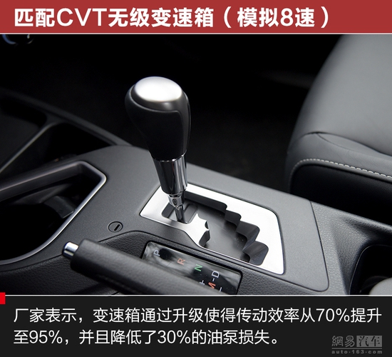 与两款发动机匹配的依然是CVT无级变速箱,可模拟8个挡位(供手动模式使用),厂家表示在经过优化之后,变速箱的传动效率有了大幅提升。