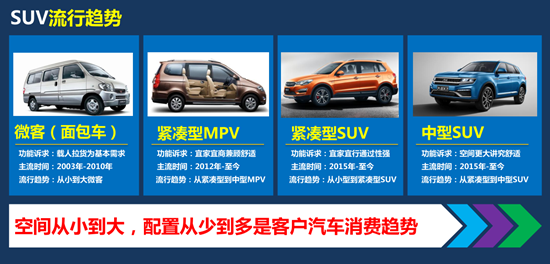 因此,通过消费者心理以及市场的表现,我们分析发现,空间从小到大,配置从少到多是老百姓对汽车需求最基本的流行趋势。