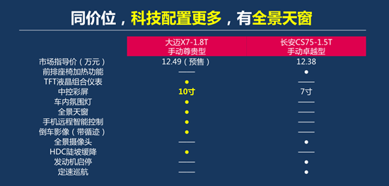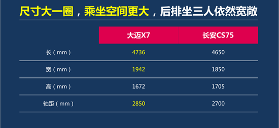 那么,与竞品相比,大迈X7究竟有哪些核心竞争力呢?长安CS75在尺寸上是介于A级与B级的A+级代表车型,其价格区间与大迈X7也有所相似。因此,通过与长安CS75的对比,我们不难发现,大迈X7的优势还是非常明显的。