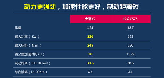 比动力,相近的价格,购买大迈X7可以享受到1.8T的动力,而CS75只能购买1.5T的动力组合。动力上的优势不言而喻。