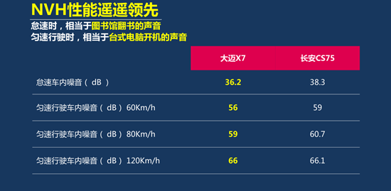 比舒适,在NVH性能方面,众泰大迈联合了国际专业团队在大迈X7整车的11大模块,26处采用了3D空腔发泡隔音降噪技术,怠速时车内的噪音仅为36.2分贝,NVH表现已经到达了合资主流的水平。