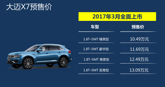 而更为关键的是,作为一款外观设计时尚、空间宽敞舒适、性能表现出众、品质工艺有保障的高性能中型长轴SUV,大迈X7的预售价仅为10.49-13.09万元。 大迈X7拥有超越中型SUV的尺寸,但售价却与紧凑型SUV相当,这份从老百姓需求考虑的诚意,显然是不言而喻的。 此外,据了解,除了1.8T+5MT,未来,大迈X7还将推出1.5T手动挡、1.8T-DCT以及2.0T-DCT等动力组合的车型。
