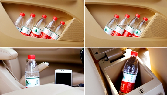 两车座舱内储物空间都不少,细细检查都能找出十几个格子来,为了让大家一目了然,我们用矿泉水来进行测量,很明显宝骏730座舱内储物空间摆放的矿泉水数量要多。不过对于日常使用,两车分别这么多的储物格已经完全够用。