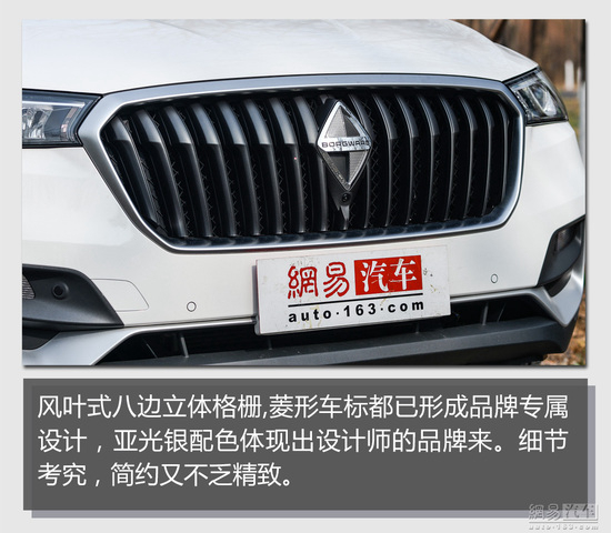细节上,哑光色镀铬饰条更显高级感,前保险杠雾灯装饰部件造型精致,视觉上增添了立体效果;后保险杠下沿增加有银色护板,然宽厚的保险杠也有了精巧感;车顶行李架并非装饰,最精彩的要数菱形编织的中网,蕴含品牌LOGO元素,风叶式八边立体格栅造型立体考究,相信也是在设计师千锤百炼下,提炼出的品牌内涵。