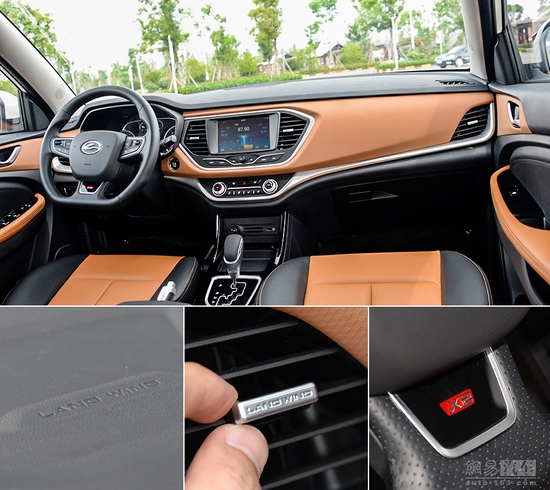内饰采用棕黑双色搭配,中间利用银色饰条点缀,整体氛围档次感颇高。在中控台顶部、空调出风口、方向盘上能看到品牌LOGO设计,对内饰的精致感起到提升作用。