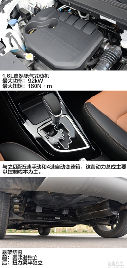 搭载1.6L自然吸气发动机,最大功率92kW,最大扭矩160N·m,与之匹配5速手动和4速自动变速箱,这套动力总成主要以控制成本为主,上市初期1.6L发动机拉低入门价格,后期会有动力更强的1.5T发动机作为补充,底盘悬架系统采用了前麦弗逊独立+后扭力梁半独立的组合。