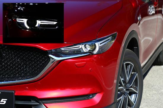 灵感源自猎豹的仿生学外观设计在第二代CX-5上体现的更为突出,第一代车型显得有些柔美,而新车型在整体线条方面变得更为凌厉。与CX-4一样,第二代CX-5在设计上采用了前凸的鲨鱼嘴式中网设计,引擎盖向前延伸到保险杠的前端,凶悍且充满攻击性,头灯的面积进一步缩小变狭长,采用了远近光一体式的LED头灯,并且日间行车灯所形成的眼神轮廓在远处看更有识别性。
