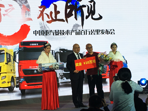 在发布会现场,中国重汽销售部总经理张晓东代表集团公司兑现承诺,为百万英雄车车主郭思峰先生颁发了2016年达成百万公里的10万元现金奖励。郭思峰先生也在接受奖励的同时分享了诸多用车感受。