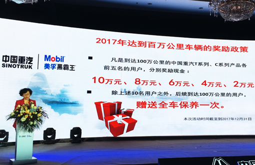 2017年3月20日,以“百万之上 不止所见“为主题的中国重汽曼技术产品百万公里发布会在山东滨州隆重召开。中国重汽与埃克森美孚强强联手,共同见证了中国重汽曼技术产品HOWO-T7H车型36个月内运营里程突破100万公里这一惊艳表现。