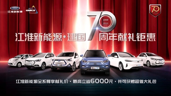 同时,江淮新能源为献礼祖国70周年华诞,隆重推出“建国70周年献礼版”系列车型,在9-10月抢购可尊享献礼价,最高立省6000元现金。