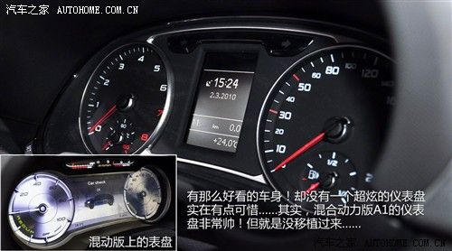 我对内饰的第一印象还算比较满意,虽然没有MINI那种英伦的古典和设计感,但是至少没有死守着家族式的一成不变,中间为圆形的三辐方向盘甚至还看出点可爱劲。不过当看到仪表盘后心又凉了半截,如此大众的表盘实在无法和MINI相比,既然不走古典路线,那么在奥迪擅长的科技感上极端一些也未尝不可。