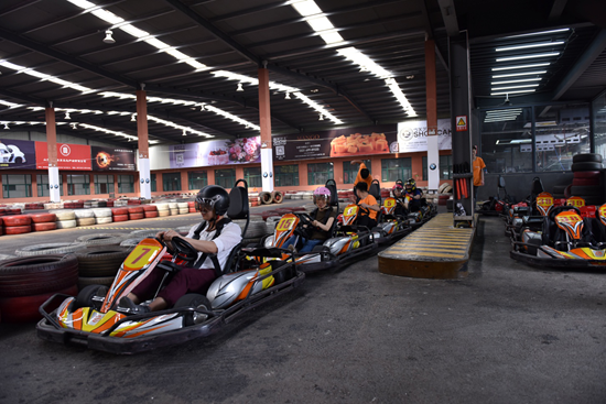 选手共分6组,每组6人参赛。比赛开始前,选手们已经个个摩拳擦掌,穿过餐吧就来到了卡丁车赛前准备区域,在场内的工作人员的指导下,选手们存放好自己的外衣包裹等,并选择了合适的头盔。赛前的一切准备就完成了。然后选手一一进入卡丁车,系好安全带,在经过工作人员对卡丁车操作的简短叮嘱后,伴着发动机的轰鸣声,选手们从起点出发,他们自由驰骋在弯弯曲曲的赛道上。在进行了大约2个多小时的比赛后,选手们最终角逐出了冠亚季军,我们为决胜者颁发了精美的礼品,然后客户签退后领取伴手礼,至此,本次活动圆满结束!