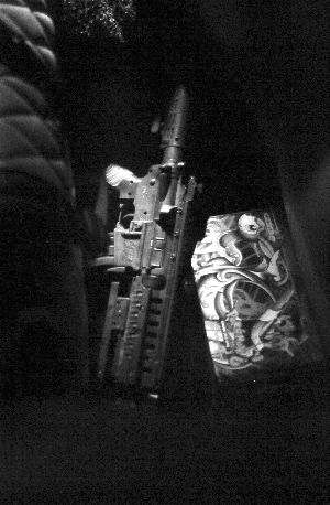 记者注意到,该无照宝马车系经过改装,前挡风玻璃上放置着一张“人民大会堂”的临时车证,而车后座下藏着一把“冲锋枪”。据了解,该枪并非真枪。